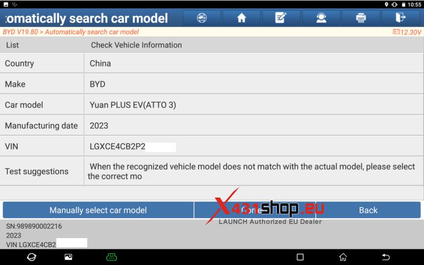 If they are consistent, click [Correct]. Otherwise, click [Manually select car model] to select the correct model for testing.